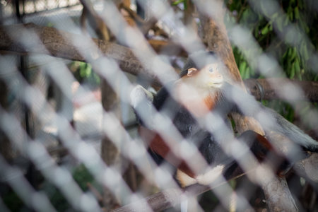 Monkey in a cage staring eyes downcast.Red-Shanked Douc Langur,Pygathrix nemaeus is a species of Old World monkey