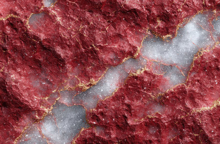 Red and white marbled texture with golden veins creates a seamless pattern suitable for various design projects, showcasing rich colors and intricate details