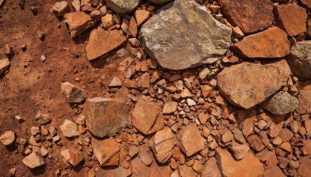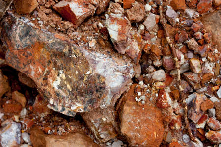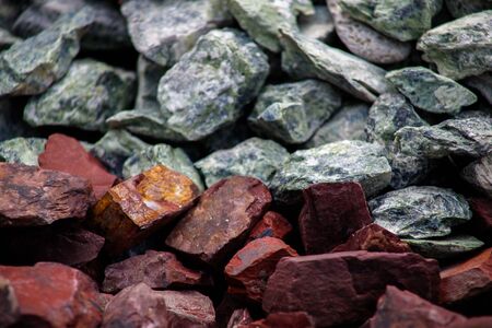 Raw ore on ground close-up. Multicolor rough stone in sunlight. Textured vivid geological background with pile of rude stones. Natural texture with copy space. Amazing mineral. Piece of rock.