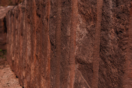 Close-up of red sandstone from the quarry with traces of drilled holes