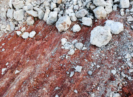 textures of various clay layers underground in clay quarry after geological study of soil. colored layers of clay and stone in section of earth, different rock formations and soil layers.