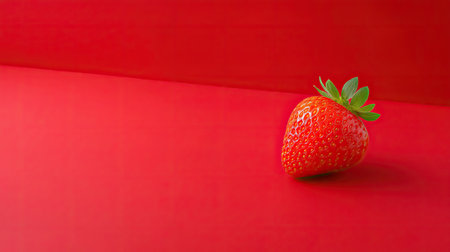 A minimalist composition featuring a perfectly ripe strawberry on a red background, highlighting the fruit's vivid color and fresh appeal.