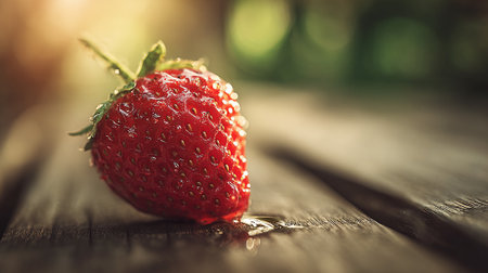 A single ripe strawberry with water droplets on a wooden surface in natural light