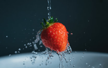 A single, bright red strawberry with green leaves is captured mid-stream as clear water cascades over it. Water splashes and droplets are frozen in motion around the fruit, creating a dynamic and refreshing visual. The background is a dark, muted blue-grey, with a lighter, reflective surface visible at the bottom, suggesting a sink or bowl.