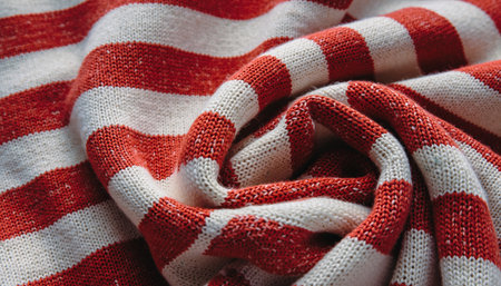 Close-up shot of a red and white striped fabric with diagonal lines, creating a textured background.