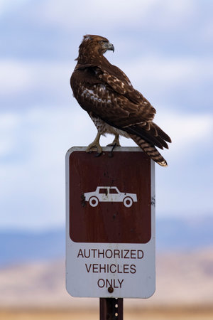Hawk perched humorously and defiantly on worn, dirty AUTHORIZED VEHICLES ONLY sign at Lower Klamath National Wildlife Refuge in California