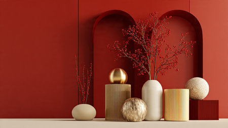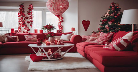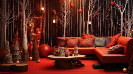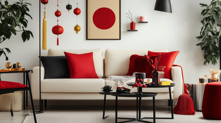 Decorative living room with red accents and festive decorations for cultural celebration
