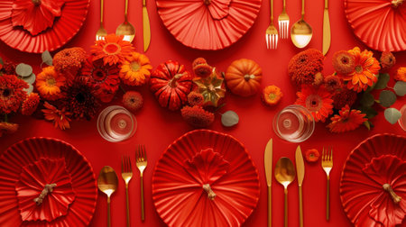 Top view of aesthetically designed table with pumpkins, autumn vibrant flowers, red color scheme. Generative AI.