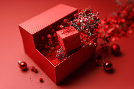 Valentine's Day design. Realistic red gift boxes. Open gift box full of decorative festive objects. Generative AI.