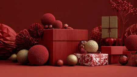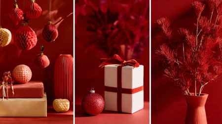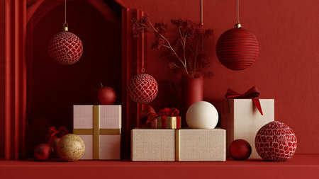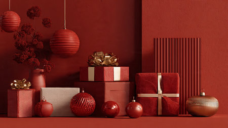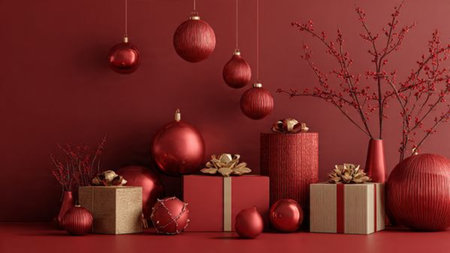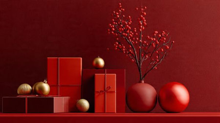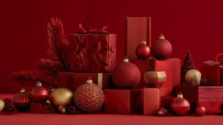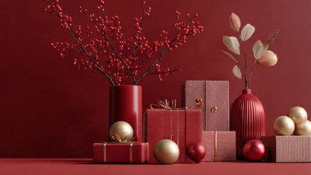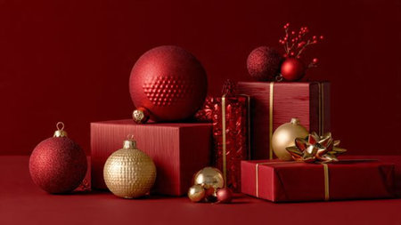 Dark red monochrome theme with selective gold ornament highlights and neat minimal gift boxes.