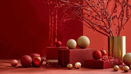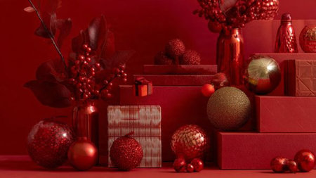 Red holiday scene with luxury polished gold accents.