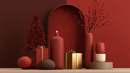 Minimalist design merging deep red surfaces with selective gold holiday accents.