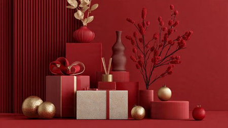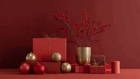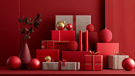 Red-focused holiday aesthetic enriched with soft golden highlights and minimalistic gift presentation.