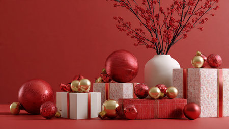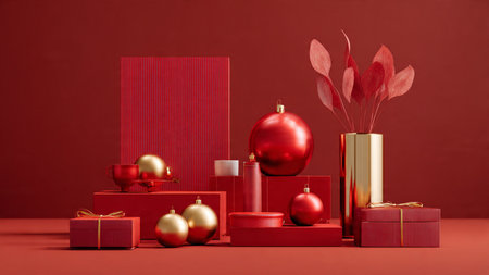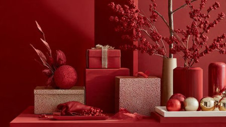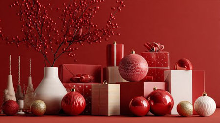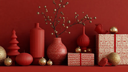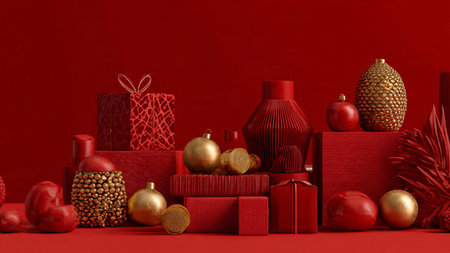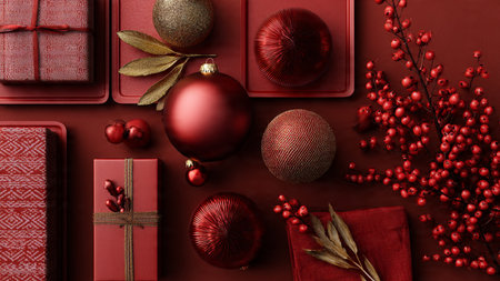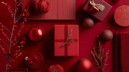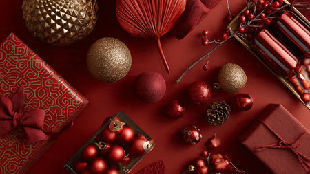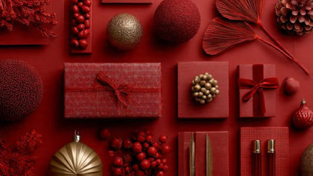 Red holiday flat-lay accented with subtle golden ornaments and minimalist gifts.