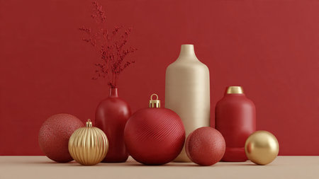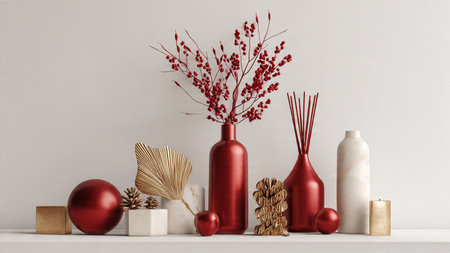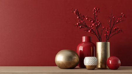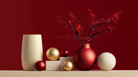 Modern red and gold winter scene with a decorative vase and red berry plant.