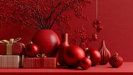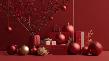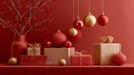 Rich red monochrome scene complemented by strategic gold ornament accents and clean gift lines.