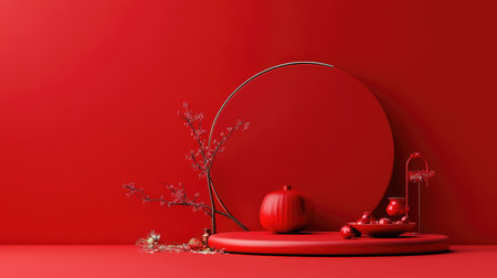 This vibrant red minimalist still life features a curved frame, pumpkins, and decorative elements, perfect for inspiring modern interior design concepts.
