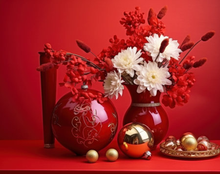 Chinese New Year Decorations in Red and Gold Featuring Lanterns, Flowers, and Ornaments. Concept of Festive Celebration, Cultural Tradition, Holiday Decor, and Vibrant Aesthetics. Background.
