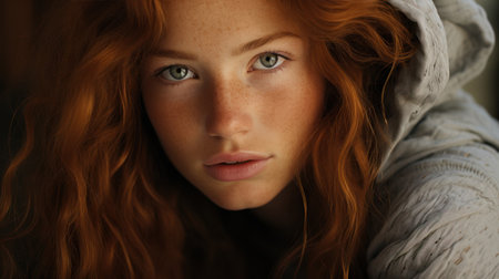 Captivating close-up portrait of a redhead girl with freckles, showcasing her unique beauty.