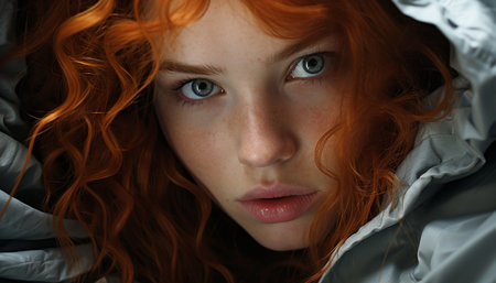 Portrait of a gorgeous young woman with blue eyes, freckles, and beautiful red hair