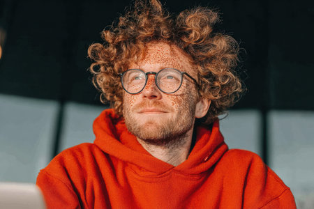 Young man with curly hair and glasses, wearing a red hoodie, gazing thoughtfully in a relaxed indoor setting with soft lighting.