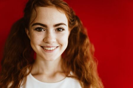 Modern fifteen-year-old girl with long curly red hair posing over grunge background. Beauty, fashion.