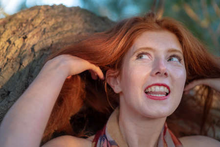 Beautiful young sexy red-haired girl is smiling happily at a beautiful gorgeous red hair