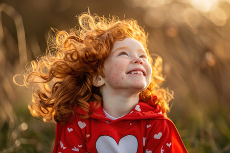 Happy child with curly red hair enjoying nature in a sunny outdoor setting with golden sunlight