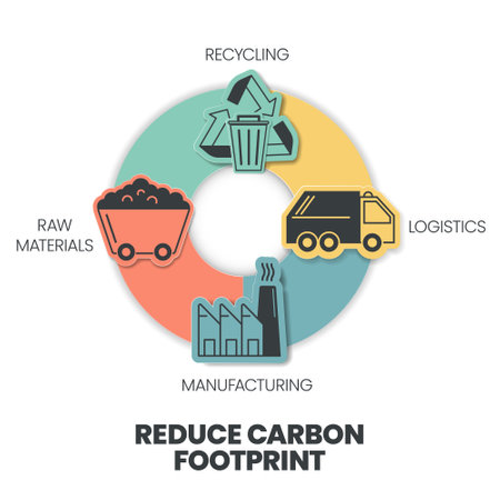 Reduce Carbon Footprint infographic has 4 steps to analyse such as raw materials, recycling, manufacturing and logistics. Ecology and environment concepts infographic presentation. Diagram vector.