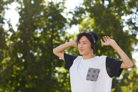 man with headphones listening music in park