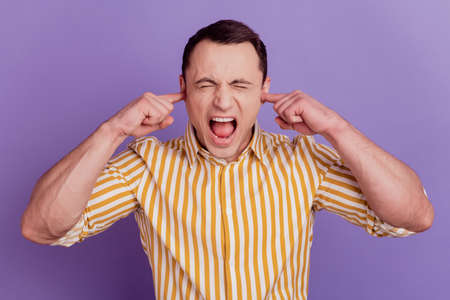 Portrait of crazy avoiding guy fingers cover ears shout close eyes on violet background