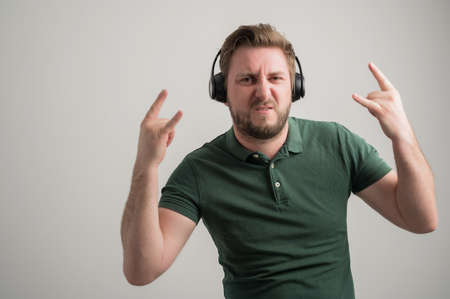 Portrait of serious stylish attractive man with thick beard, dressed in casual green t shirt listening rock music isolated on gray background with copy space advertising area