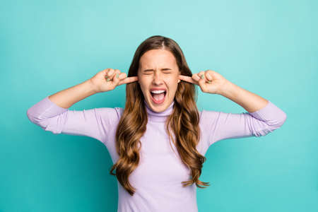 Closeup photo of crazy beautiful stressed lady hiding ears fingers inside avoiding parents fighting eyes closed yelling wear casual purple turtleneck isolated teal pastel color background