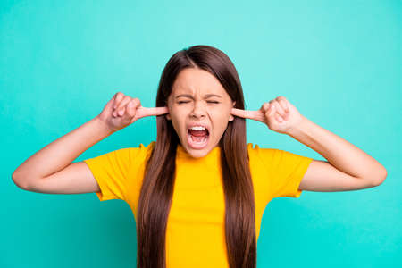 Photo of angry girl close cover ears with index finger yell loud wear yellow t-shirt isolated over turquoise color background