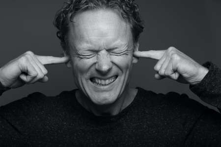 Handsome middle-aged man with salt pepper hair dressed with sports shirt is plugging his ears with fingers to not hear noise or words: he seems very disturbed