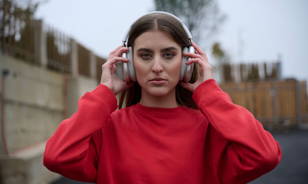 Portrait of young woman listening music trough headphones.