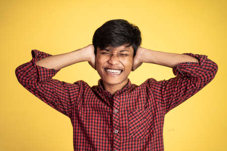 Deaf young man with closed eyes covering ears. Handsome guy cannot hear. Deafness concept