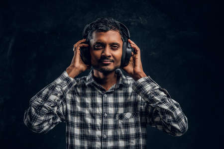 Handsome Indian guy is happy listening to music in wireless headphones standing in studio against the background of the dark wall