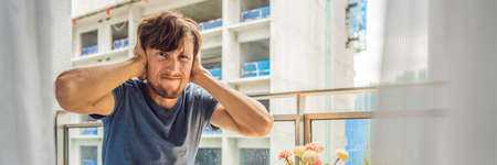 Young man on the balcony annoyed by the building works outside.