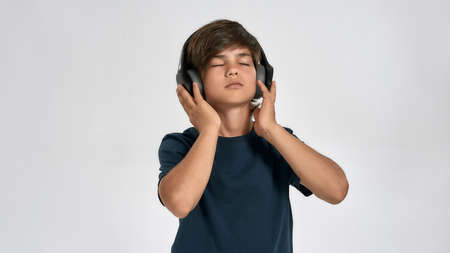 Little sportive boy child in sportswear wearing headphones, listening to music, standing with eyes closed isolated over white background