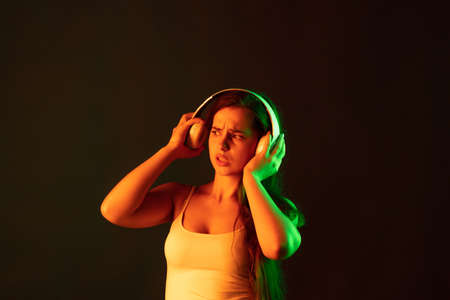 Portrait of emotive young woman in headphones posing over brown background in neon light. Shocked news. Concept of information, technology, beauty, lifestyle, youth, emotions, facial expression, ad