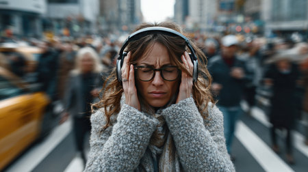 A young woman wearing headphones stands in a bustling urban street, appearing overwhelmed by her surroundings, showcasing the intersection of emotions and city life.