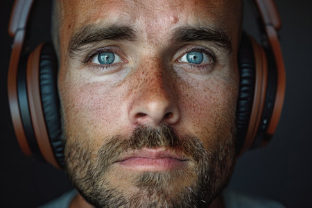 Closeup of an Afroamerican man with headphones, minimalist style, monochrome white and black background, modern and fresh