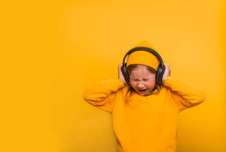 Portrait of stylish cute little kid girl listening music in headphones and singing against pink background. School child listening loud music in wireless earphones and dancing.