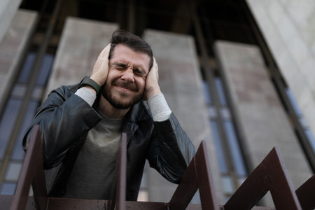 Man covers his ears and roars at night on the street