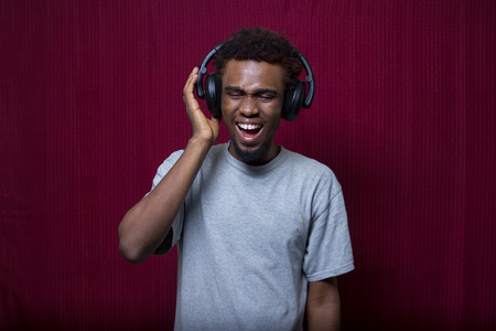 African-American guy with headphones listening to his favourite music