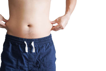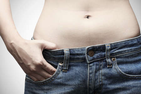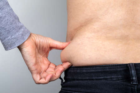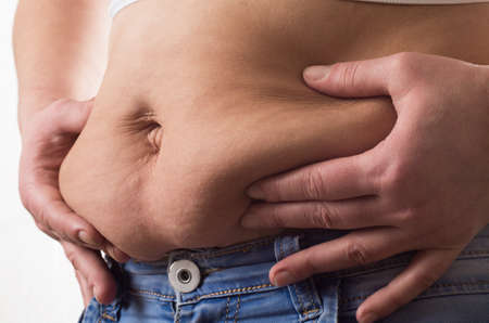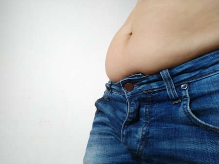 Saggy belly. Folds of leather and fat on the sides hanging over the waist of the jeans. A figure spoiled by overeating or pregnancy. Obesity and Diabetes. White background. Cellulite flabby muscles