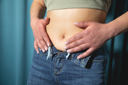 Cropped mid section of an obese woman trying to close the buttons of her jeans against a white background