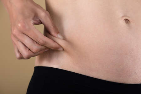 Cropped shot of woman touching and squeezing her belly.