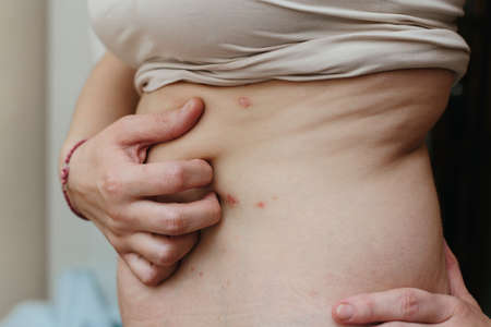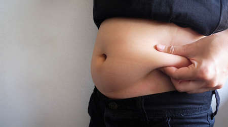 Closeup of fat folds on big belly of overweight woman. Concept of excessive weight, obese female, dieting and overweight problems